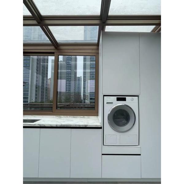 Elevate your laundry space with Fadior's modern and minimalist laundry cabinet, designed for functionality and style. Featuring a sophisticated light gray door panel with a sleek handle-less design, this cabinet seamlessly integrates with any contemporary interior. The light-colored cabinet body and white quartz countertop complement the elegant light gray flooring, creating a clean and harmonious aesthetic. Crafted from premium stainless steel, this cabinet not only offers exceptional durability but also adds a touch of modern sophistication to your home. Ideal for those who appreciate clean lines and a clutter-free environment, this laundry cabinet is a perfect blend of form and function.