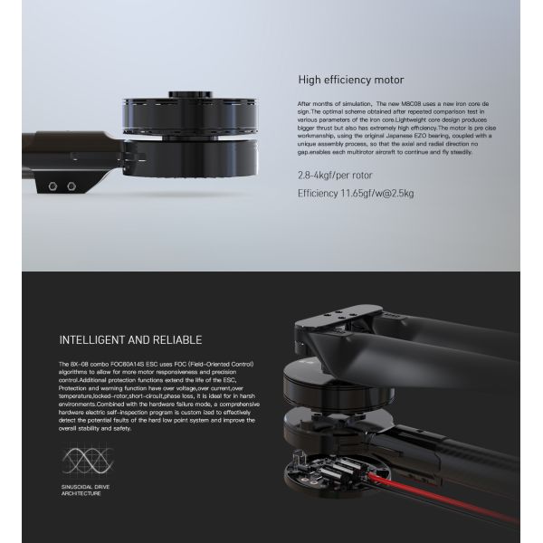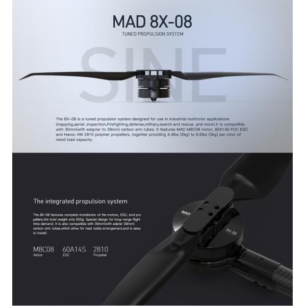 The 8X-10 is a tuned propulsion system designed for use in industrial multirotor applications(mapping,aerial ,inspection,Firefghting,defense,military,search and rescue ,and more).lt is compatiblewith 30mm(with adapter to 28mm) carbon arm tubes. it features MAD M8C10 motor, 60A14S FOC ESCand Havoc AW 2810 polymer propellers, together providing 6.6lbs (3kg) to 8.8lbs (4kg) per rotor ofrated load capacity.