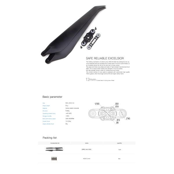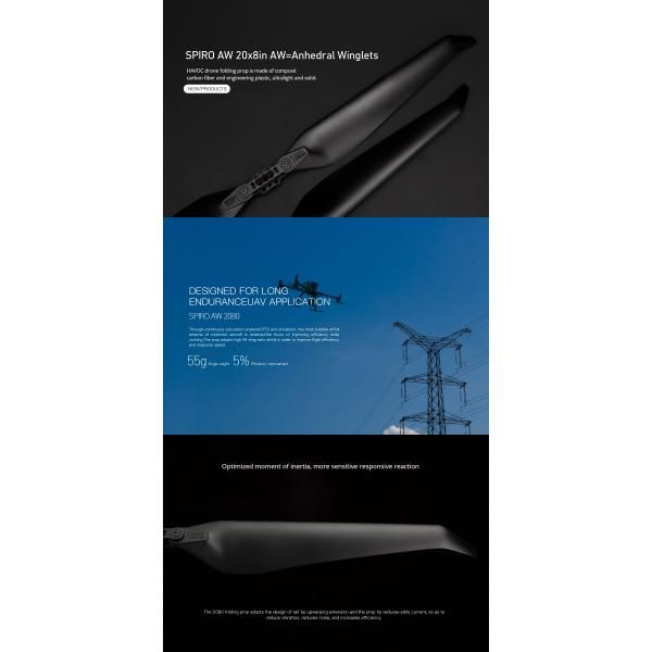 The folding mechanism of carbon prop SPiRO AW 2080 has undergone very rigorous assembly test and increases the contact area of the lock screw thread, soas to greatly reduce the risk at the oars due to loose screws.The upper and lower prop plates are made of high strength imported aluminum6061-T6 to ensure better rigidity and strength of the prop plates.M3 high strength screw is used for folding prop lock screw.The contact surface of prop plate is equipped with customized high-qualityTeflon gasket, which has longer service life and higher safety factor.