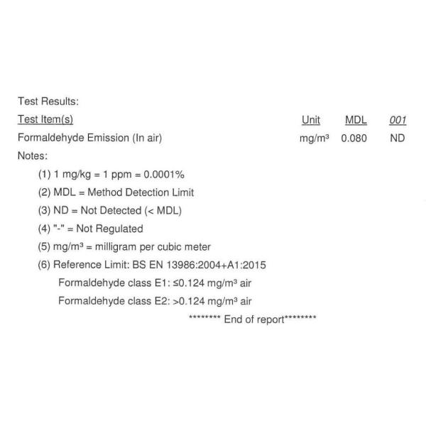 Eco-Friendly Test = E1 with reference to EN 717-1:2004 , analysis was performed by UV-Vis .