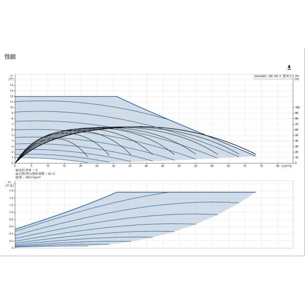 circulation pump used in commercial buildings. Rated flow rate: 16.04 m ³/h Rated head: 9.2 m Liquid temperature range: - 10 .. 110 °C Liquid temperature during operation: 60 °C Maximum operating pressure: 10 bar Application scenarios:The Grundfos MAGNA3 is suitable for commercial heating. | ![]() |