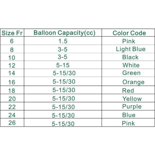 | Balloon Capacity (cc): | 8-10Fr 3-5cc ,12-14Fr 5-10cc 16Fr 15cc,18-24Fr 30cc |