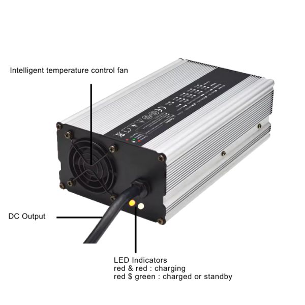 This lithium battery charger is designed for high performance, safety, and durability. Featuring a robust aluminum casing with an integrated cooling fan, it ensures efficient heat dissipation during long charging sessions. With a power range of 100W to 2000W, it supports various lithium battery systems including LiFePO4 and NCM, making it suitable for electric vehicles, solar storage systems, and other applications.
