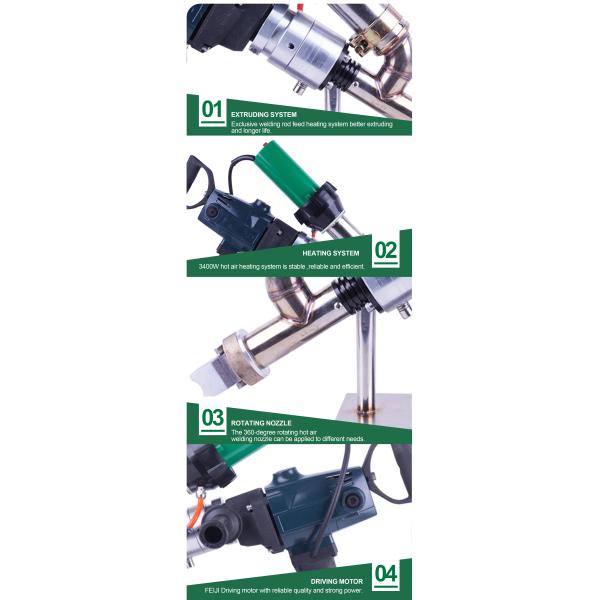 This extrusion welder uses a single-stage heating system, supports at least eight hours of work per day, and can weld PE, PP, PVC and other material.