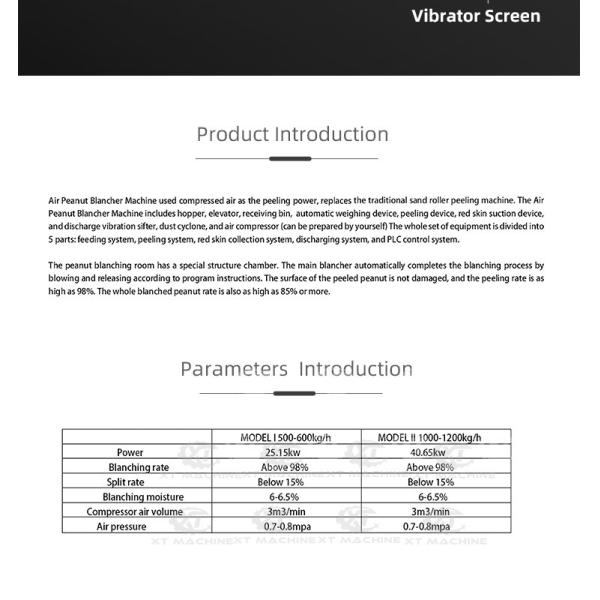 Air Peanut Blancher Machine used compressed air as the peeling power, replaces the traditional sand roller peeling machine. The Air Peanut Blancher Machine includes hopper, elevator, receiving bin, automatic weighing device, peeling device, red skin suction device, and discharge vibration sifter, dust cyclone, and air compressor (can be prepared by yourself) The whole set of equipment is divided into 5 parts: feeding system, peeling system, red skin collection system, discharging system, and PLC control system. The Peanut Blanching Room has a special structure chamber. The main blancher automatically completes the blanching process by blowing and releasing according to program instructions, The surface of the peeled peanut is not damaged, and the peeling rate is as high as 98%. The whole blanched peanut rate is also as high as 85% or more.