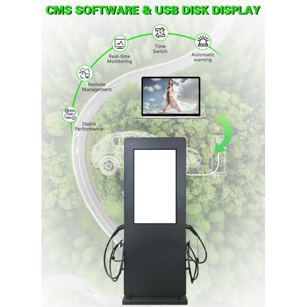 Outdoor Charging kiosk with fan cooling system waterproof outdoor display for Advertising,Ip65 protection with different Charger for the option 7KW 11KW 22KW 44 KW fast charging. Charging platform intergrate on the Charging system for RFID scanning show the charging payment on the side integration.