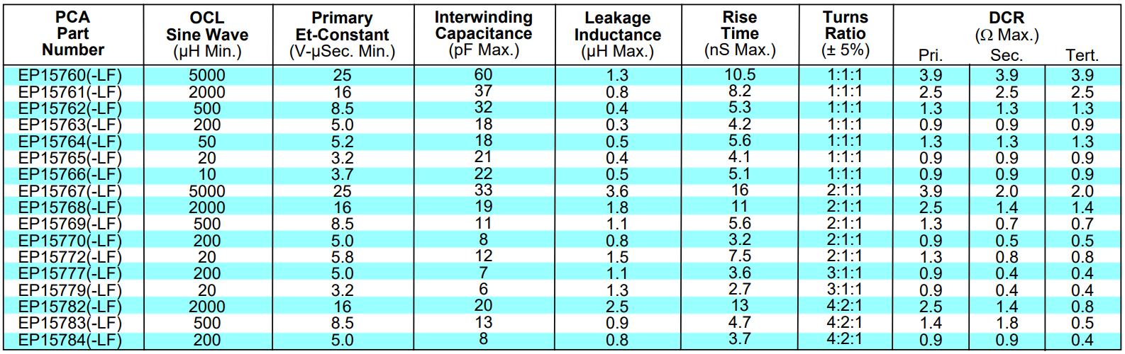 | Product name: | Power Magnetics Pulse Stand-Off Type Transformers EP15763-LF / EP15764-LF |