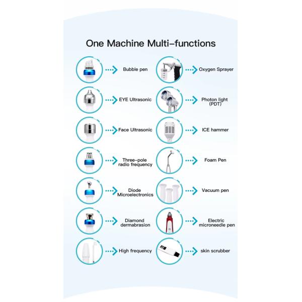 | Handles | 14 Handles(Bubble pen+EYE Ultrasonic+Face Ultrasonic+Three-pole radio frequency+Diode Microelectronics+Diamond dermabrasion+High frequency+Oxygen Sprayer+Photon light(PDT)+ICE hammer+Foam Pen+Vacuum pen+Electric microneedle pen+skin scrubber) |