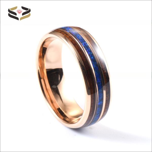 8mm Tungsten Carbide Men Wedding Ring With Hawaiian Koa Wood And Blue Opal Inlay Religious Type Other Rose Gold Plating
