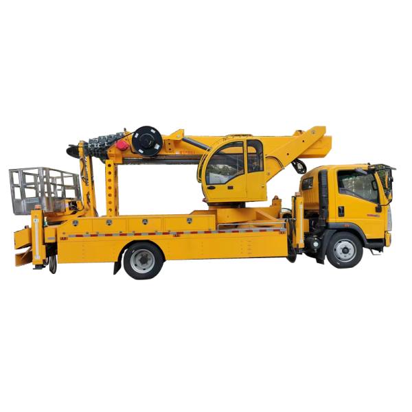 The work vehicle can achieve high-altitude work with a platform load of 200kg, a maximum working height of 32m, and a maximum working amplitude of 15m for the boom. The work platform is automatically leveled. | |