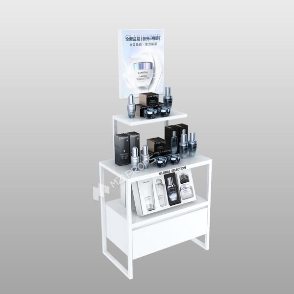 This Cosmetics Display Stand Mainly Adopts A 15 * 30mm Iron Square Tube Structure, Sprayed With White Glossy Paint, And Soft Film Light Box, Creating A Fashionable And Simple Display Effect.