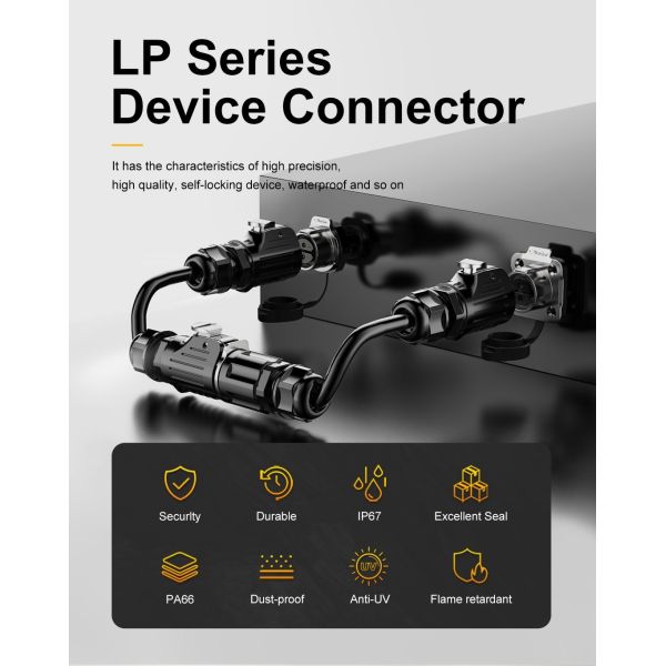 The technical performance of this product complies with international standards such as UL and TUV. The locking of the male and female ends adopts a press-type metal lock design and has a locking safety