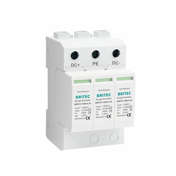 The BRITEC DC Surge Protection Device, model BRPV3-1000-6.25, is a reliable lightening protector designed to safeguard your equipment from power surges. With certifications from TUV, CB, CE, ROHS, and ISO9001, this DC SPD is manufactured in China with high-quality standards.