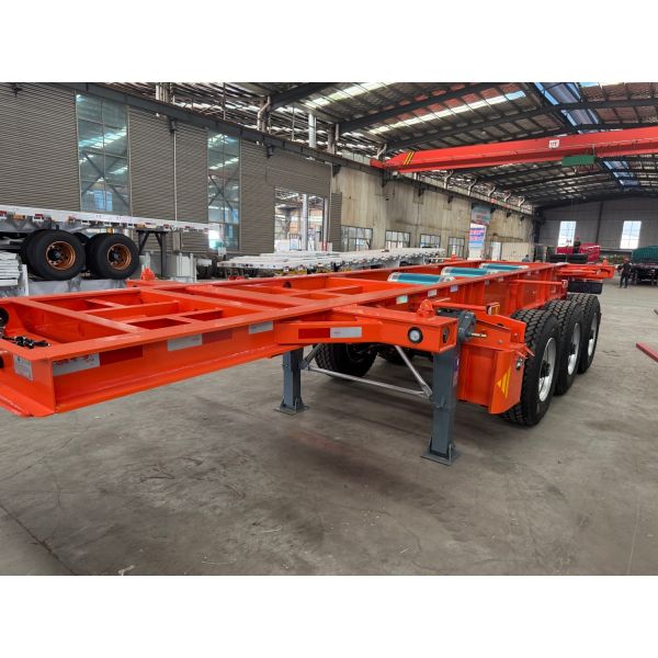 The Large single tires with air suspension Steel Skeleton Semi Trailer is engineered for efficient and reliable container transport. With its robust design and high payload capacity, this semi-trailer is ideal for heavy-duty trucking applications.