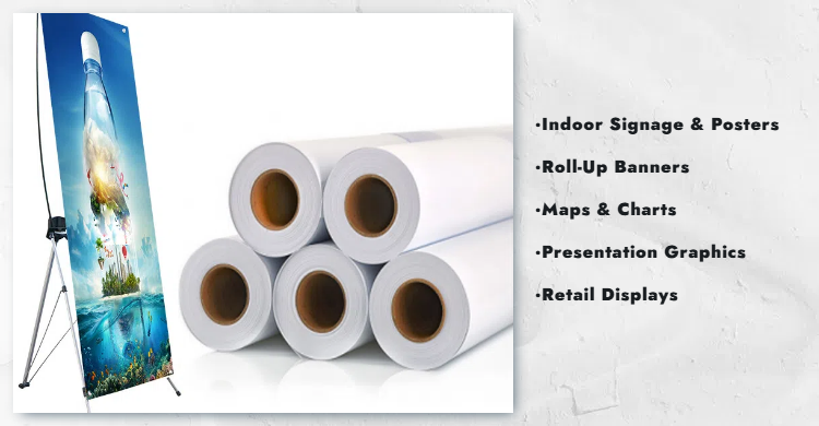 Featuring a smooth matte finish, it offers excellent color reproduction and sharp image detail, making it ideal for indoor signage, posters, roll-up banners, and retail displays.