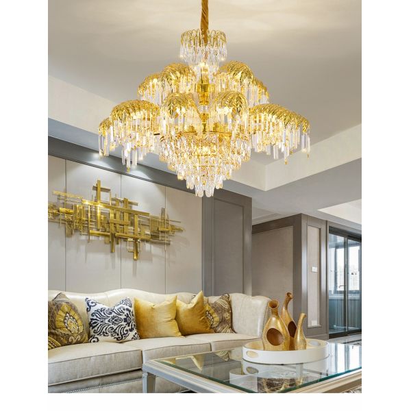 Inspired by classic French palace design, this luxury crystal chandelier features cascading layers of high-quality crystals and a finely crafted metal frame. It exudes timeless elegance and brings a royal ambiance to living rooms, dining areas, hotels, and grand halls.