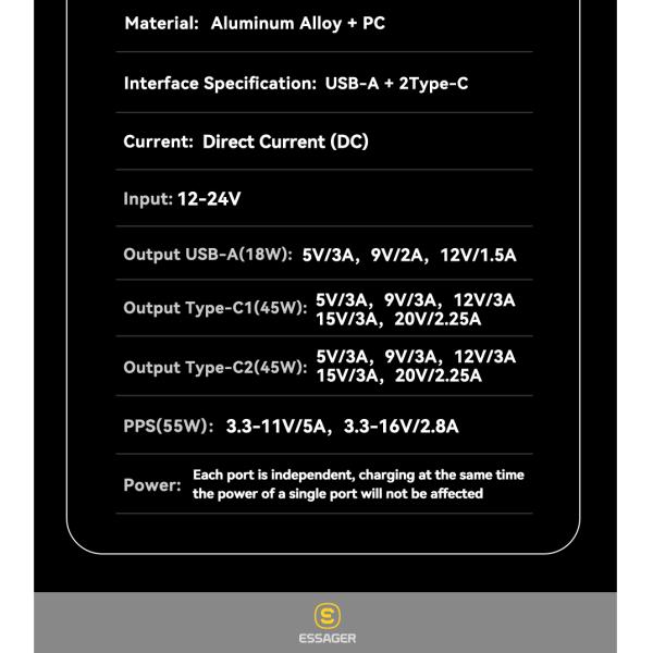 Product Name | ESSAGER FSJ-008 Series 105W 3 Ports Fast USB Type C Car Charger |