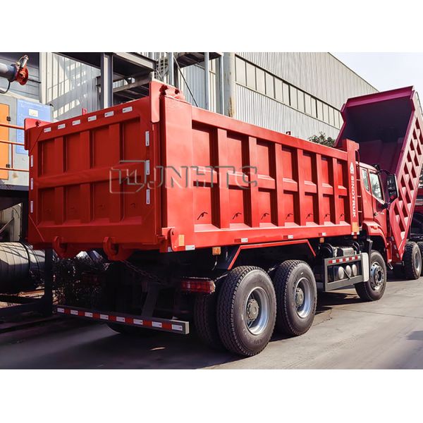 Hydraulic Lift System: The dump bed is raised by a hydraulic lift system, allowing materials to slide out of the back. This hydraulic mechanism is essential for quick unloading, as it tilts the bed upwards, guiding the material toward the rear exit.
