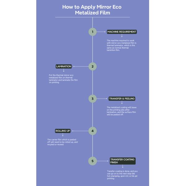 Mirror Eco Metalized Film solves all the major issues associated with conventional metalized transfer films. Its thermal compatibility, superior adhesion, and high-gloss finish ensure top-notch performance and aesthetic appeal. The film’s eco-friendly nature addresses environmental concerns by reducing plastic usage, while its scratch resistance and printability enhance operational efficiency and versatility.