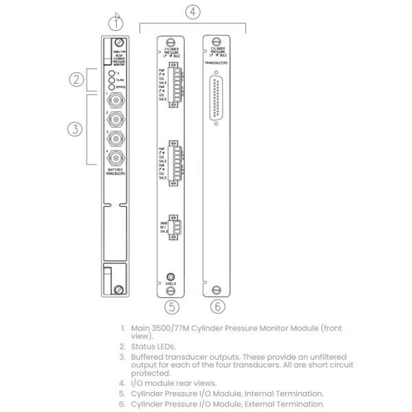The 3500/77M Recip Cylinder Pressure Monitor is a 4-channel monitor that accepts input from Bently Nevada approved pressure transducers, conditions the signal to make various pressure measurements for reciprocating compressors, and compares the conditioned signals with user-programmable alarms.