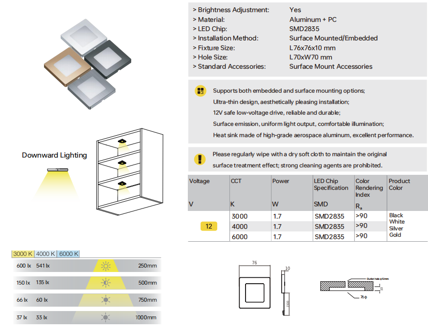 A112D Surface Mounted Square cabinet light, DC12V, 2.5W, 3000K/4000K/6000K, PC+Aluminum, Ra>90