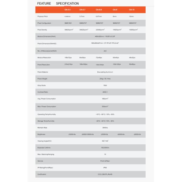 Common anode low voltage power supply, lower powe!consumption,low attenuation,temperature rise lowerthan 20°C,more than 50% energy saving, 2 year warranty, 5000~8000nit brightness.