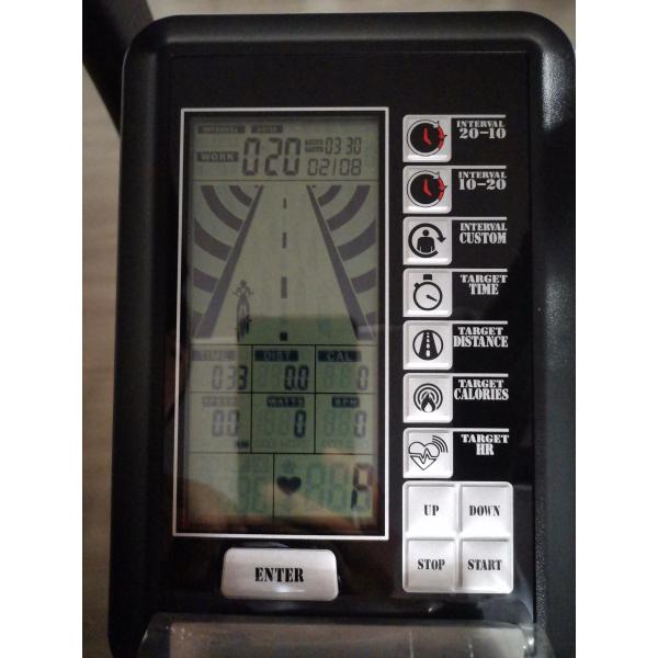 The display shows: time, speed, distance, calories, infinite heart rate, speed, etc.