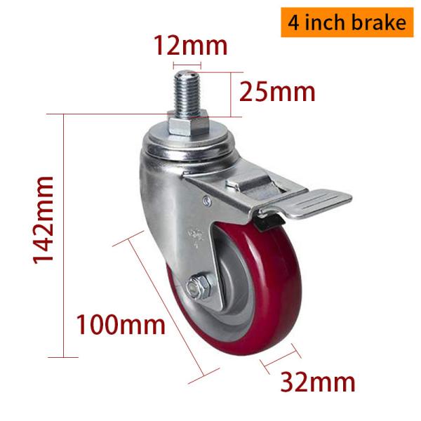 EDL Medium Duty 4inch 150kg Red TPU Threaded Caster by Swivel and Brake type 504S-86