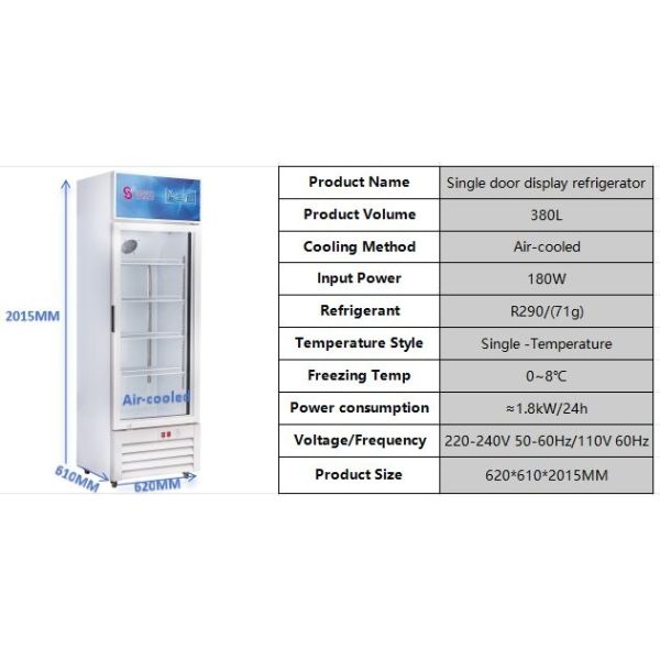 Model SC-380LP Single-door glass door air-cooled Commercial preservation display refrigerator,size: 620mm*590mm*2015mm; Capacity:380L; No load temperature: 0 to 8 ℃. Function:It is used to store beverages, vegetables, and fruits, and can keep them fresh and better show them to guests for selection. Set different sizes to meet different needs.It has wide applicability.