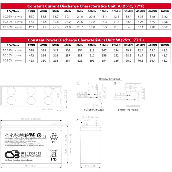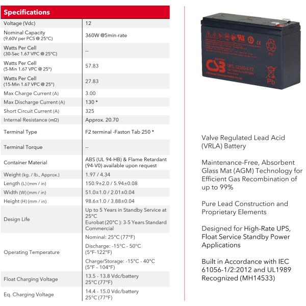 | Nominal Capacity (9.60V per PCS @ 25°C): | 360W @5min-rate |
