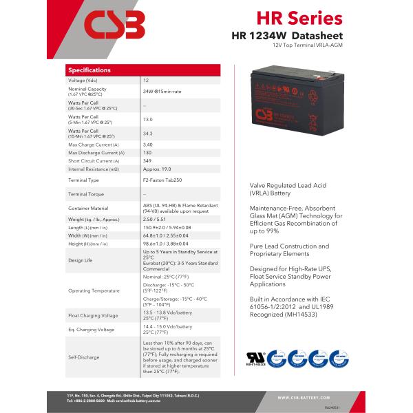 Model NO. | CSB Battery HR1234W 12V 34W |