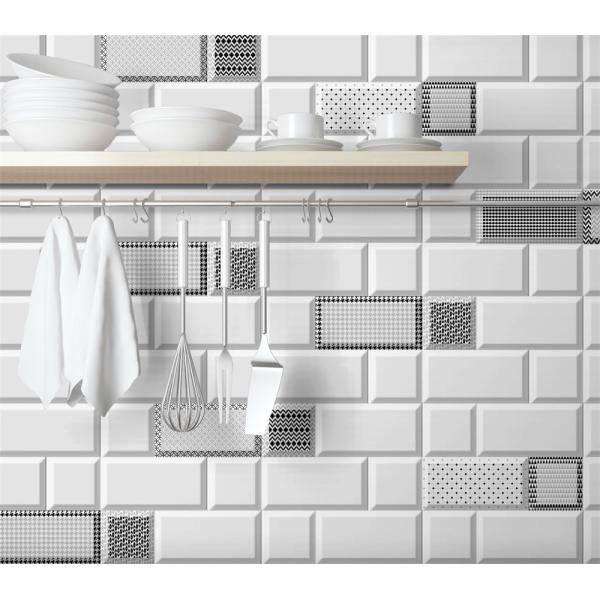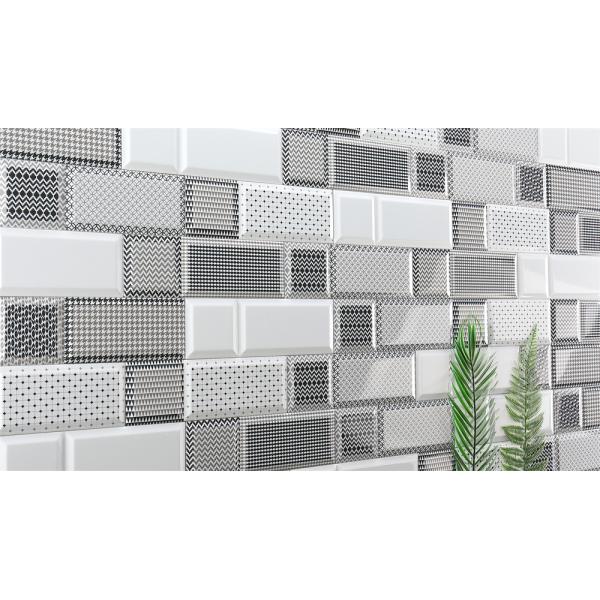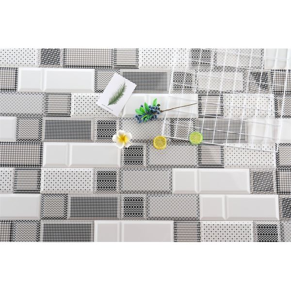 Color and pattern: The inside wall tiles are presented in varying shades of gray, with detailed textures and patterned designs that include elements such as geometric shapes, dots and stripes. The combination of these patterns is modern , adding an artistic atmosphere to the interior space.