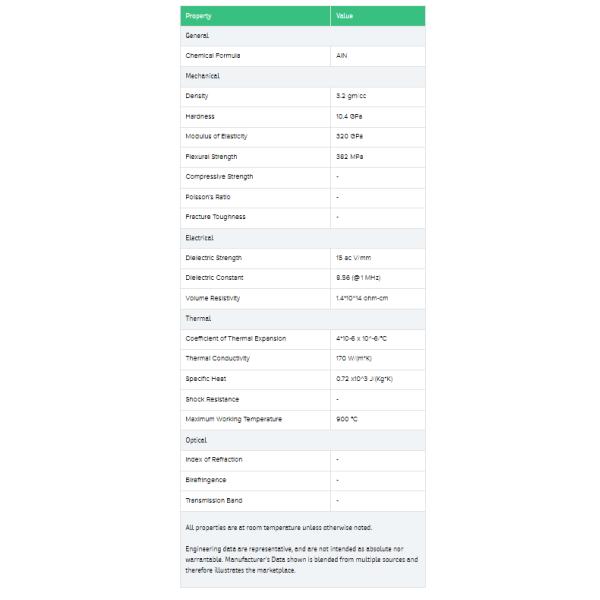 Aluminum Nitride (AlN) is the only technical ceramic material that features an extremely interesting combination of very high thermal conductivity and excellent electrical insulation properties.