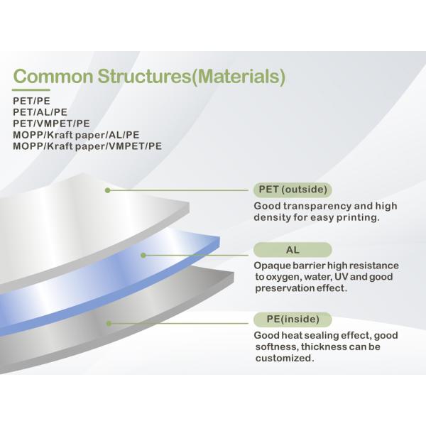 | Material Options | Food grade material MOPP/PET//PE/AL or customized |