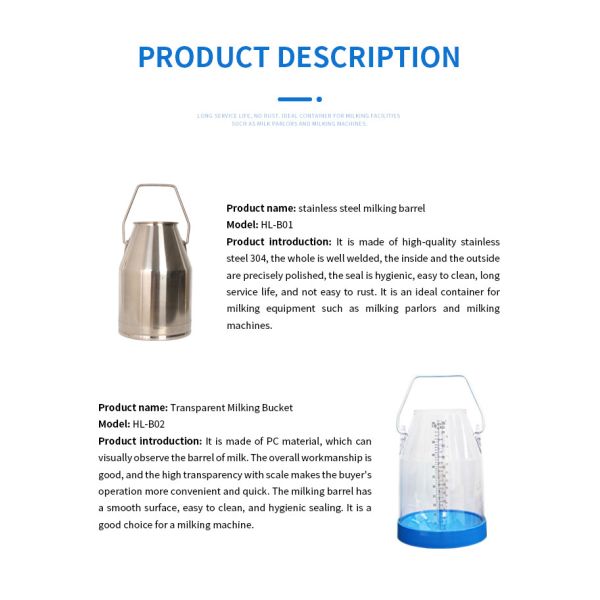 The HL-B01 model is specifically crafted to meet the needs of dairy farmers looking for a durable and efficient milk bucket. Its height of 485mm provides ample space for collecting milk during the milking process, allowing for smooth operations and minimal spillage.