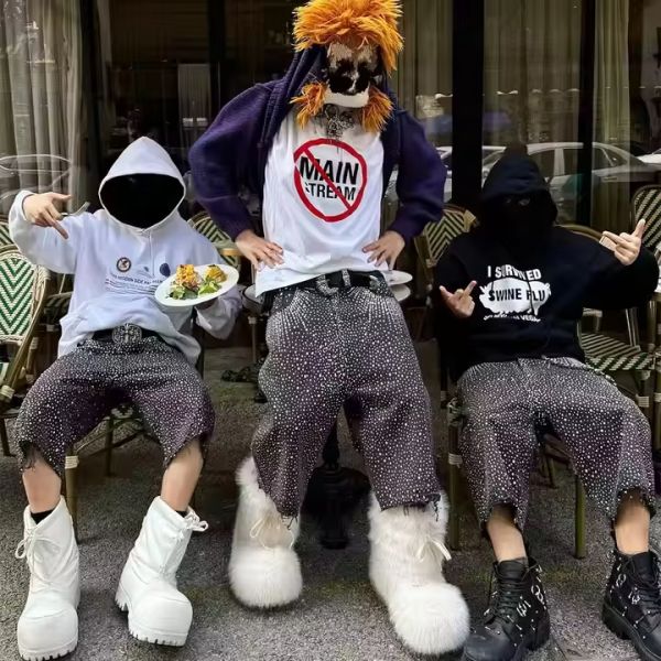 Diamond Rhinestone Distressed Denim Jeans Shorts Baggy Jorts Men |