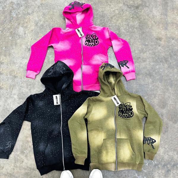 Clothing Manufacturers Custom Puff Printing Hoodie Streetwear Acid Wash Designer Clothes Zip up Vintage Rhinestone Hoodies