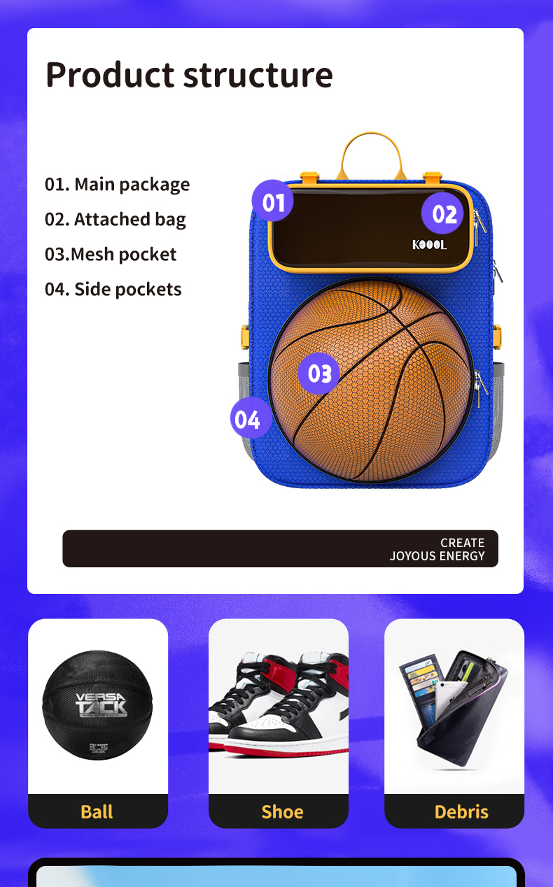 Ample Storage & Organization: Multiple pockets, including a front organizer compartment for small accessories, mesh side pockets for water bottles or umbrellas, and a large main cavity for basketballs, clothing, and other essentials.
