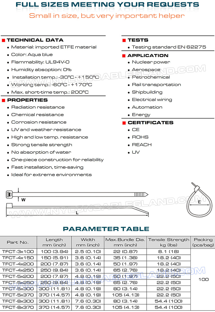ETFE (TEFZEL) cable ties are the ideal cable ties for chemical processing and nuclear power plants or any environment subject to harsh conditions as they very resilient ties. Lowest threading force of any one-piece cable tie in the industry. Curved tip is easy to pick up from flat surfaces and allows faster initial threading to speed installation. Ideal for applications requiring resistance to environmental stresses.