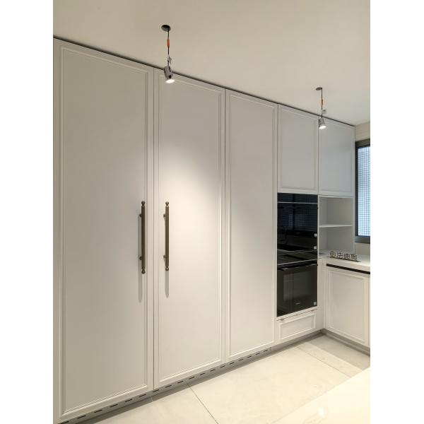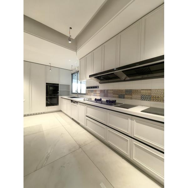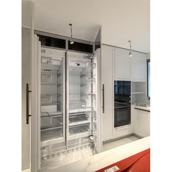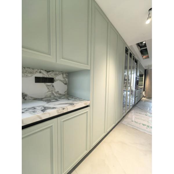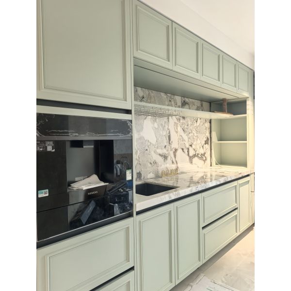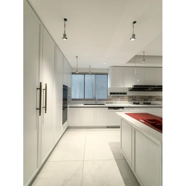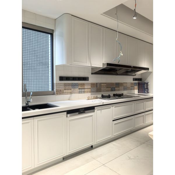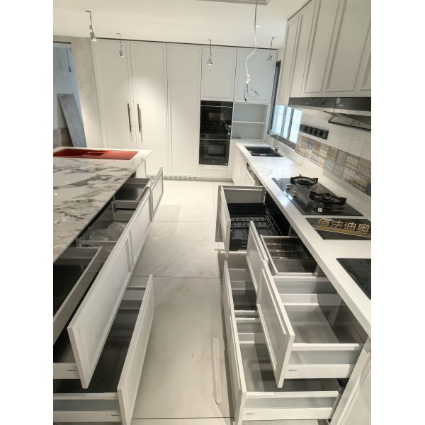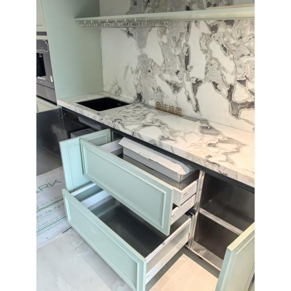 Elevate your kitchen with the Fadior Full Stainless Steel Custom Kitchen Cabinet. Constructed entirely from premium stainless steel, this cabinetry delivers unmatched durability, corrosion resistance, and easy maintenance—key perks that make stainless steel a game-changer for bespoke home cabinetry. The design blends crisp white and soft mint green finishes seamlessly, paired with a functional island layout (featuring a striking red integrated component for added utility). It also integrates top-tier appliances and hardware, balancing timeless style with practicality for a truly tailored culinary space.