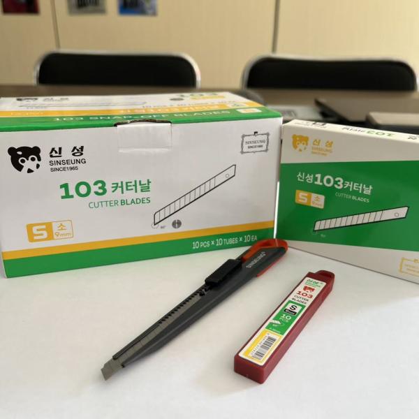 SINSEUNG 9mm Cutter Blades, model S103, are versatile tools suitable for various product application occasions and scenarios. With a minimum order quantity of one carton containing 8000 pieces, these cutter blades come in packaging details of 10pcs per tube, 10 tubes per small box, and 8 small boxes per big box.