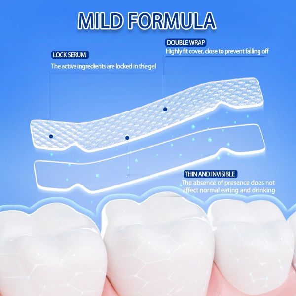 【HOW TO USE】Brush your teeth and rinse your mouth before use to ensure your teeth are clean.Take out the strip, peel off the protective film, and apply the strip tightly to the surface of your teeth.Wait 15-30 minutes according to your personal needs, then remove the strip.After removing the strip, clean your teeth with water or by brushing.