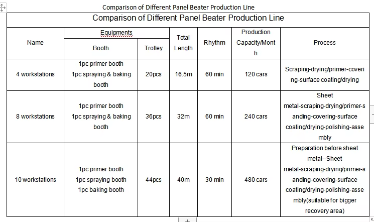 Automotive Panel Beater Production Line. Automotive panel beater production line refers to the reasonable decomposition of the paint repair process, and the division of labor between equipment and personnel according to the process flow. A complete small damage repair process is generally divided into 7-10 workstations (sheet metal, scraping, polishing, primer, covering, surface paint, drying, polishing, assembly). The number of workstations is flexibly selected according to the repair and painting production capacity. Each workstation adjusts personnel according to the workload, responsible for different processes, ensuring that the working hours of each workstation are similar. The working hours of technical personnel at each workstation are strictly controlled to ensure that the vehicle is completed according to the planned time, and the quality of each workstation is strictly controlled to ensure the quality of the vehicle's sheet metal spraying after completion. All vehicles are completed according to the expected time. Advantages: Compared with ordinary operation methods, the panel beater production line can provide 30% or more efficiency ,maximize production capacity and reduce secondary investment costs, 2. Save work area and human resources 3. Follow the production rhythm, and the complete time is controllable, 4. The process of each vehicle is handled in production line, following the steps to reduce the time required for vehicle movement 5. Convenient for management and the quality is guaranteed