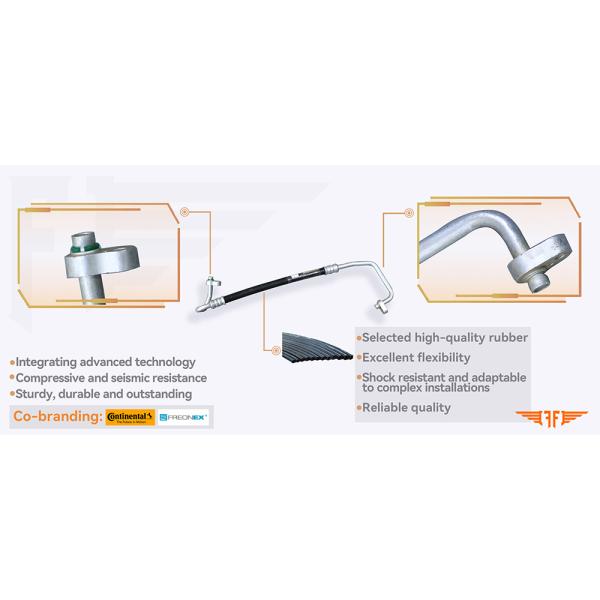 Our air conditioning ducting is primarily constructed of aluminum, combined with highly flexible hoses, allowing it to bend and move easily in tight spaces. It seamlessly integrates with other components of the vehicle's air conditioning system, making installation a breeze. We use high-quality rubber or synthetic materials that are resistant to pressure, corrosion, and aging, and incorporate reinforced braiding to ensure excellent pressure, vibration, and weather resistance, making it easily resistant to complex road conditions and extreme temperatures. We understand that safety is paramount and strictly adhere to industry standards to provide you with a long-lasting, stable, safe, and worry-free air conditioning system.
