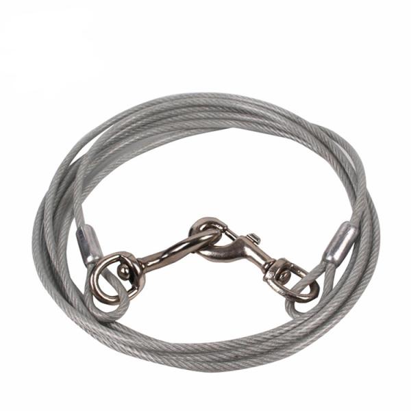 Our PVC coated steel core cable pet leashes also called pet tie out cable,PVC coated steel wire rope for dogs or PVC coated dog tie out cable with steel core. It's construction is 7X7, diameter is 2.38mm/3.97mm,length is 15 Feet.
