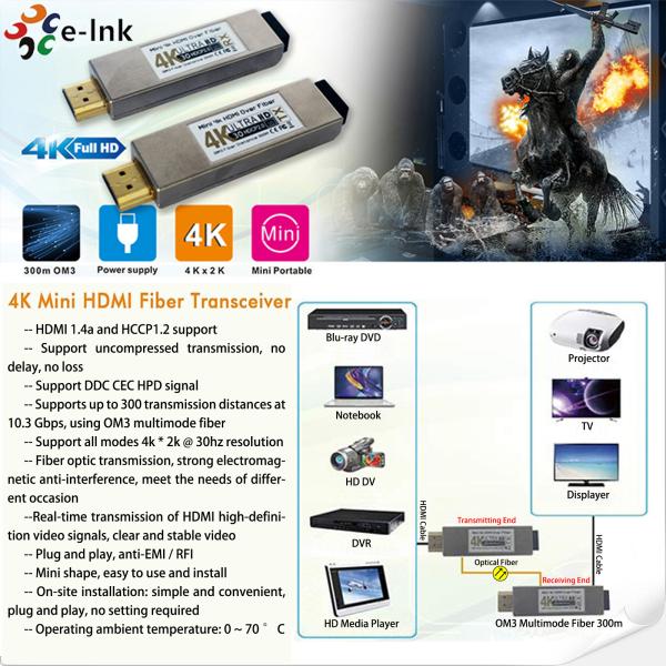 LNK-106M | Mini HDMI Optical Transceiver: 1-Ch HDMI 1.4a Video Signal(4K*2K), OM3 Multi-mode Fiber, 300 meters, LC, including 1 transmitter & 1 receiver, used by pairs, USB Power Input |