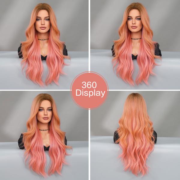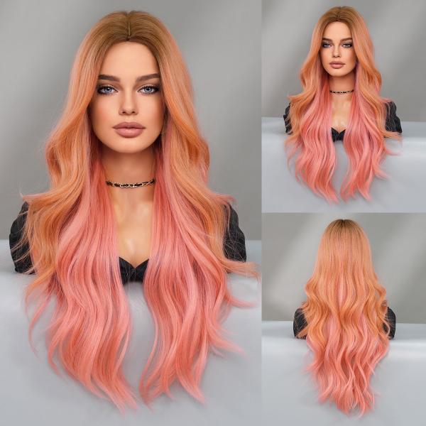 Model Name: Fashion Long Body Wave Dark Root Hair Pink Synthetic Wigs For Women