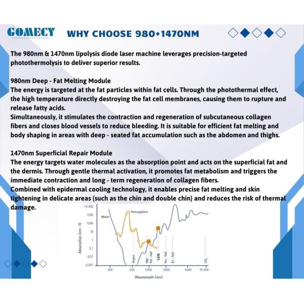 The 980nm wavelength penetrates deeply, directly targeting fat particles inside adipocytes. Its photothermal effect generates controlled high temperatures that rupture fat cell membranes, releasing fatty acids for natural metabolic elimination.