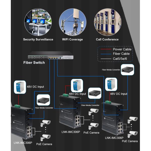Industrial Automation Networks: Provides PoE+ power and data connectivity for PLCs, IP cameras, and sensors in smart manufacturing systems, with fiber optic links ensuring EMI immunity in electrically noisy environments.