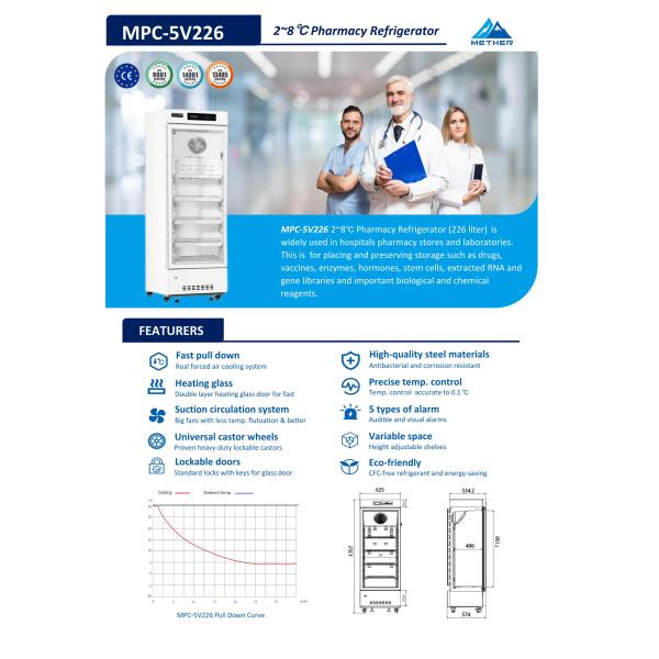 The MPC-5V226 Pharmacy Refrigerator is designed for the safe storage of temperature-sensitive pharmaceuticals and laboratory materials. With a capacity of 226 liters and a stable 2~8℃ temperature range, it provides reliable refrigeration performance for hospitals, pharmacies, and research laboratories.